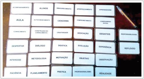 Apresentamos aos entrevistados as 32 fichas - já mencionadas na metodologia e podem ser observadas na figura 1 - e pedimos que eles selecionassem e separassem as expressões em dois grupos de 16 palavras, um grupo com as palavras mais importantes para eles, sobre o estágio, e o outro com as menos importantes. Das 16 palavras selecionadas como mais importantes, pedimos que novamente escolhessem as oito mais importantes e as oito menos importantes. Finalmente, das oito mais importantes, pedimos que escolhessem as quatro expressões mais relevantes sobre o estágio. Dessas quatro, pedimos aos entrevistados que hierarquizassem os itens de acordo com o seu grau de importância em relação ao ECS.