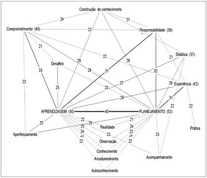 Essas informações foram processadas nos programas Evoc e Simi para a organização da árvore de similitude cujos resultados estão disponíveis na figura 2. O filtro de ocorrência simultânea considerou o mínimo de 30% de compartilhamento entre as escolhas feitas. A árvore apresenta dois núcleos com fortes tendências organizativas das escolhas em planejamento e aprendizagem, os quais possuem 14 arestas e compartilham praticamente todos os elementos que integram a árvore da similitude, escolhidos pelos informantes. Tais elementos são os que têm maior probabilidade de pertencerem ao núcleo central das representações sobre o ECS. Didática, experiência, responsabilidade e comprometimento explicitam as suas ligações (ZANCUL, VIVEIRO, 2012). É importante pontuar a ausência, na árvore de similitude organizada, dos termos escola, alunos, teoria e reflexão, os quais têm significativa relevância nas propostas do ECS.