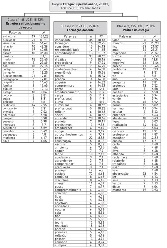 O conteúdo transcrito das entrevistas foi processado pelo software ALCESTE e o corpus Estágio Supervisionado originou três classes. A classe 1 descreve elementos do estágio associados à estrutura e ao funcionamento da escola - como a escola funciona, hierarquização das funções dentro do sistema educacional e equipe pedagógica. A classe 2 refere-se à importância do estágio na formação de professores, dando ênfase à aprendizagem adquirida durante o estágio, à experiência, ao amadurecimento e contato com a realidade escolar. Já a classe 3 apresenta as ações do estágio, regências, observações e metodologias de ensino. Em síntese, os espaços das classes são, respectivamente, da Escola, da Universidade e do Estágio. A apresentação das classes dá-se a partir das suas localizações no dendograma e está ilustrada na figura 3.