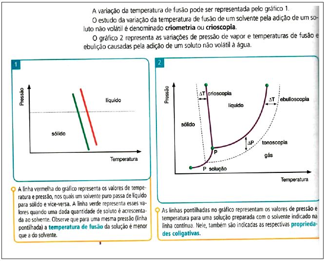 Em pesquisa realizada por Pereira e Núñez (2013) com livros didáticos de Química aprovados no PNLD 2012, Propriedades Coligativas foi um dos conteúdos que mais se utiliza de gráficos cartesianos, assim como Termoquímica e Soluções. Segundo Santos et al. (2013, p. 3), as definições operacionais de Propriedades Coligativas “envolvem a capacidade de compreender e relacionar muitas variáveis e de como interferem em fenômenos como a evaporação, condensação e fusão”.