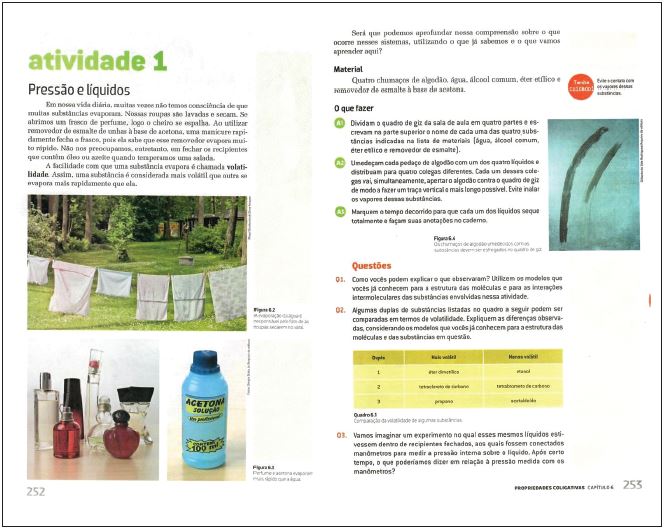 E1L4: O livro trata das propriedades coligativas por meio de textos. Então ele aborda o texto um, o texto dois, o texto três e assim sucessivamente. Cada texto traz uma atividade, um fenômeno, um experimento do cotidiano. Por exemplo, secar roupa no varal, hidratar fruta, perfume, acetona, removedor de esmaltes, essas coisas para tratar de determinados assuntos. Então ele apresenta essas propriedades e os conteúdos matemáticos estão implícitos e dispostos em linguagem natural. Então, por exemplo, diferente do pessoal daqui do lado, o nosso não trouxe nenhuma fórmula, não trouxe exemplos gráficos, o máximo é assim algum exemplo tabular, mas que não envolve duas grandezas, envolve uma informação.