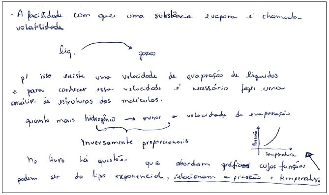 Com relação a esta temática os professores-estudantes ponderam que o professor de Química pode estabelecer uma abordagem interdisciplinar com Matemática ao sugerir aos alunos que coloquem esses líquidos em copos graduados e analisem a altura em que se encontram, comparando a velocidade de evaporação de cada um deles, conforme sugere um dos estudantes-professores: