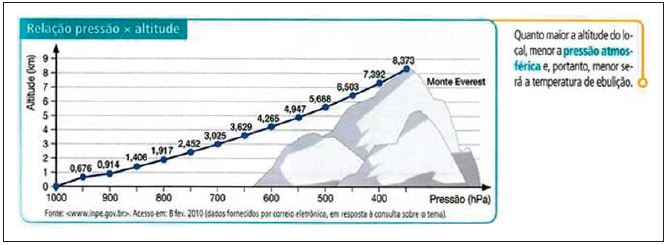 E1L4: É sim, tem uma atividade relativa às questões do ENEM (Figura 15) e daí mostra uma representação tabular a respeito da altitude e da pressão atmosférica. Isso nem é citado no conteúdo do livro. E daí abaixo, a gente até pensou que fosse a representação gráfica do que está na tabela, mas na verdade, é outra informação. É uma informação da pressão da água em relação à temperatura. Aí o que o aluno pode perceber matematicamente, é que a altitude é inversamente proporcional à pressão atmosférica. Mas isso não é abordado no conteúdo. Aí seria uma interpretação própria do aluno com relação ao que está sendo exposto.