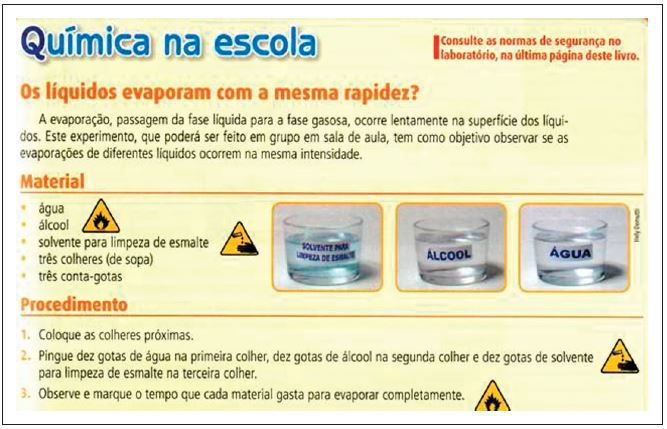 O grupo de professores-estudantes também destaca a possibilidade do trabalho interdisciplinar de Química e Matemática no desenvolvimento de atividades experimentais, desde que o encaminhamento seja readequado para fazer uma análise matemática do fenômeno. É o caso, por exemplo, da investigação em que o livro propõe determinar qual líquido evapora mais rapidamente: água, álcool ou solvente para limpeza de esmalte (Figura 4).