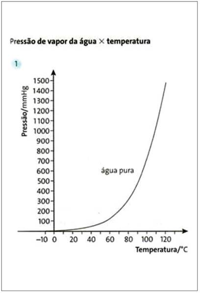 E2L2: Aí a partir disso quando ele começa a abordar a tonoscopia, a ebulioscopia e a crioscopia, basicamente ele usou registro gráfico e tabular. E quando ele começa tonoscopia, [levanta o livro na página], ele começa com uma tabela (Figura 6) relacionando temperatura e pressão. A partir dessa tabela foi construído o gráfico (Figura 7). Só que no gráfico, ele não colocou os pontos. E aí o E1L2 ficou meio encanado porque ele ligou os pontos; o que deixou a gente mais impressionado é que falou que essa curva é uma hipérbole e não se referiu a uma exponencial, nem uma quadrática; simplesmente falou que é uma hipérbole. Então isso é uma coisa para pensar, se é uma hipérbole ou não. Mas não falou qual é o modelo [referindo-se à expressão algébrica], né? Assim já não tem mais característica de modelagem.