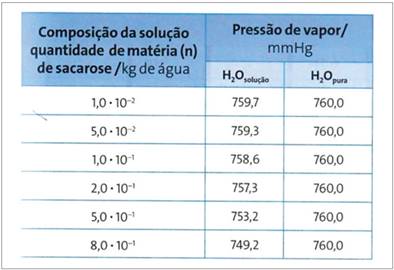 E2L2: Ainda na tonoscopia [folheando o livro ainda na posição vertical], ele traz uma outra tabela (Figura 8) e aí ele começa a mostrar que a adição de um soluto, no caso de uma sacarose, na água, e dependendo da concentração de sacarose que você faz, a pressão dela se modifica, ou seja, você aumenta a quantidade de pressão, da concentração de sacarose, ele diminui aqui a questão da pressão. Então faz essa relação por meio de uma tabela, só que ele não está relacionando esse caso a tabela com o gráfico (Figura 9) [apontando para tabela e gráfico presentes na mesma página], o gráfico diz outra coisa. [...] Então, como que encontrou esse gráfico, né? Então para a gente é bacana, ter esses vários registros né? Aqui nesse gráfico [apontando para o gráfico] ele faz essa questão da comparação também de um puro com uma solução. E aí tem toda essa abordagem matemática por traz disso.