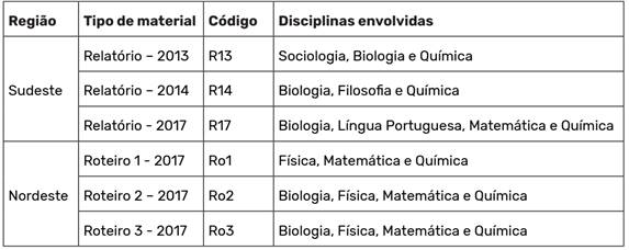 O desenrolar dessas experiências e vivências, no caso da universidade do Sudeste, culminou na produção de relatórios. Os licenciandos matriculados na disciplina de estágio se organizam em grupos com três/quatro membros, geralmente de cursos diferentes. Cada grupo escolhe um tema que contemple as disciplinas envolvidas e elaboram uma proposta interdisciplinar para desenvolverem juntos em uma escola pública. Ao final do processo, o grupo escreve coletivamente um único relatório, no qual é narrado todo o processo de imersão na escola, observação de aulas e desenvolvimento do projeto interdisciplinar. Nesses documentos, há trechos com os relatos identificados de cada licenciando e as análises, impressões e reflexões conjuntas dos estagiários. Os relatórios foram elaborados em três oferecimentos distintos de uma das disciplinas de estágio, abrangendo o período de 2013 a 2017. Eles serão denominados pela sigla R, seguida dos dois algarismos finais do ano de sua produção.
