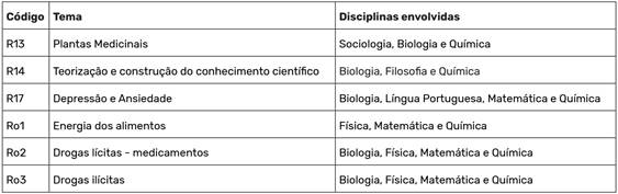 Assim, no contexto da universidade do Nordeste, os licenciandos produziram roteiros de aulas com cunho interdisciplinar, dentre os quais são elencados três. Os temas destas atividades encontram-se no Quadro 2 na próxima seção. Os roteiros, que apresentam sequências de desenvolvimento das etapas das aulas propostas, foram desenvolvidos em 2017. Eles serão identificados pelas siglas Ro1, Ro2 e Ro3, conforme consta no Quadro 1. Os roteiros Ro1, Ro2 e Ro3 foram organizados para atividades a serem realizadas em até cinco encontros de 1h e 15minutos. As turmas eram compostas por estudantes do 1º e 2º anos do Ensino Médio. As atividades foram construídas nos momentos de Atividade Complementar (AC) que ocorrem uma vez por semana, durante 2 horas, nas escolas da rede pública estadual com a participação de professores da escola, da universidade, licenciandos e mestrandos, sujeitos oriundos das áreas de Biologia, Física, Química e Matemática. As atividades em sala de aula eram realizadas por um professor da escola e um licenciando.