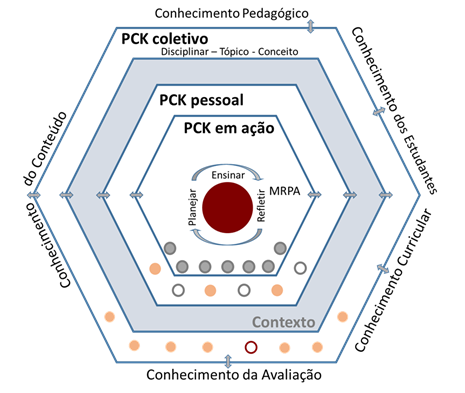 O MCR do PCK conecta visualmente diferentes camadas complexas de conhecimentos e experiências, bem como as influências que moldam a prática educativa dos professores durante sua trajetória profissional, sendo constituído por múltiplas camadas, das quais o professor ocupa a camada mais interna (Figura 1). Isso revela, por um lado, a importância atribuída aos diferentes aspectos que são mobilizados ao se ensinar ciências em uma sala de aula específica e, por outro, reforça o valor das pesquisas que se centram no raciocínio pedagógico do professor e na natureza dinâmica do PCK (Carlson, & Daehler, 2019).