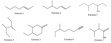 Para facilitar a socialização das análises e o seu entendimento, dividimos em quatro episódios a aula que teve como temática nomenclatura de cadeias ramificadas. Como estratégia para alcançar seu objetivo - nomear cadeias ramificadas -, o professor inicialmente lança o tema da aula para os estudantes e desenha na lousa sete estruturas distintas (Figura 2).