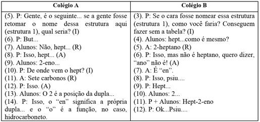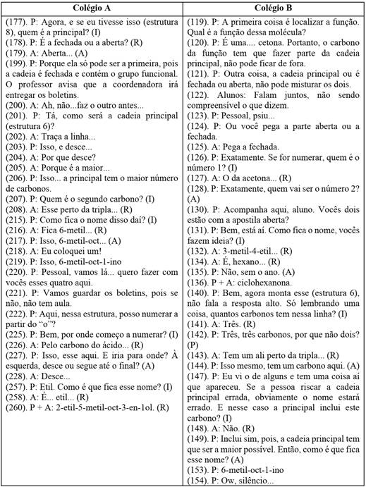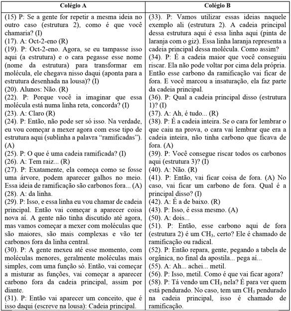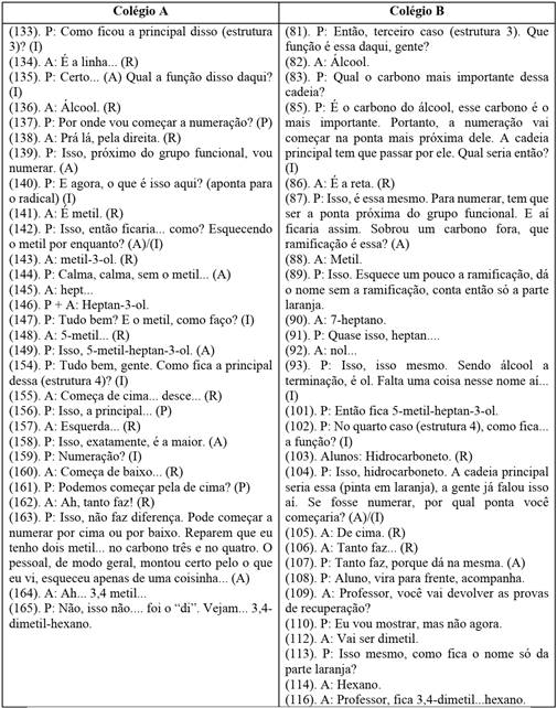 Neste primeiro momento, em ambas as instituições, o professor inicia as discussões resgatando uma ideia desenvolvida anteriormente, nomear uma cadeia não ramificada (estrutura 1). Desse modo, possibilita que o estudante aprenda os conceitos do novo assunto e destaca similaridades e diferenças entre uma cadeia ramificada e uma cadeia não ramificada. A seguir, apresentamos na figura 3 trechos desse episódio.