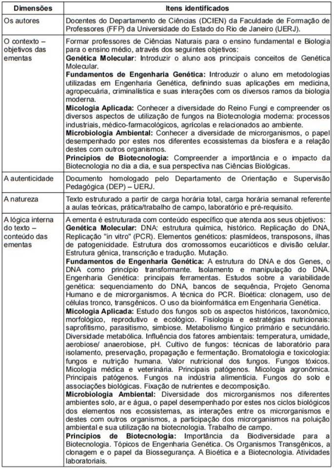 A análise das ementas demonstrou que dentre as 48 disciplinas do Curso de Licenciatura em Ciências Biológicas, cinco disciplinas relacionavam o tema da tecnologia do DNA recombinante. Apenas uma destas disciplinas era obrigatória e nomeada como Genética Molecular; as outras eram disciplinas eletivas restritas ao Curso de Ciências Biológicas, denominadas de Fundamentos da Engenharia Genética, Micologia Aplicada, Princípios de Biotecnologia e Microbiologia Ambiental, dentre as 21 eletivas. Após a análise, os dados das ementas foram agrupados conforme as cinco dimensões propostas por Cellard (2012), os quais estão listados abaixo (Figura 1).