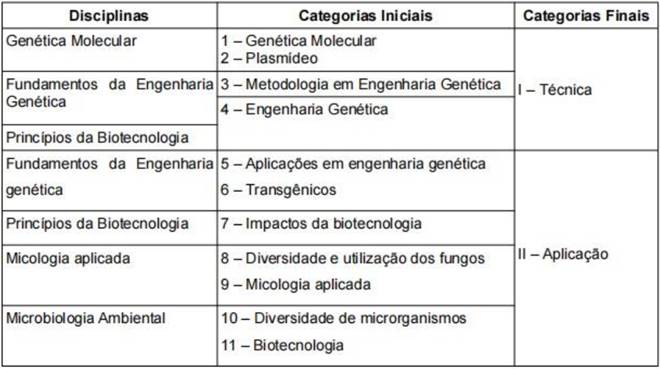 As disciplinas Genética Molecular, Fundamentos da Engenharia Genética e Princípios de Biotecnologia foram agrupadas na categoria Técnica com base no conteúdo das ementas. Isso corroborou a análise dos objetivos de Genética Molecular e Fundamentos de Engenharia Genética, cujos descritores encontrados já apontavam um caráter voltado para as técnicas. No caso de Fundamentos de Biotecnologia, os descritores encontrados em seus objetivos apontaram um caráter focado na Aplicação. Dessa forma, para classificar as disciplinas em categorias finais, os descritores observados nos objetivos e no conteúdo das ementas foram combinados.