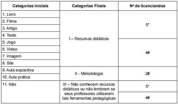 Após a entrevista com os dez licenciandos em Ciências Biológicas da referida instituição pesquisada, suas respostas às perguntas - a) “Conhece referências bibliográficas, vídeos, jogos ou outros recursos didáticos que abordam o DNA recombinante?” e b) “Quais recursos didáticos seus professores utilizaram para abordar esse conteúdo?” - foram organizadas em onze categorias iniciais e posteriormente agrupadas em três categorias finais (Figura 3).