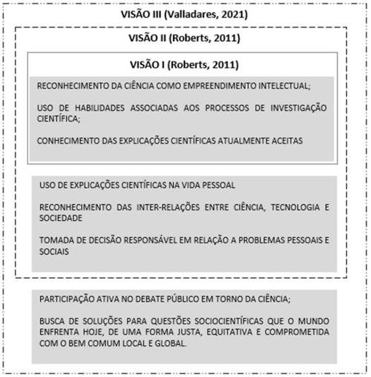 Mais recentemente, os estudos CTS evidenciaram como a sociedade e a cultura são co-construídas pela ciência, essa nova concepção exigiu uma nova visão da Alfabetização Científica. Como resposta, inspirada nos trabalhos de Yore (2012), Liu (2013) e Santos (2008) que discutem novas perspectivas para a Alfabetização Científica, Valladares (2021) expandiu o escopo conceitual desenvolvido na visão II de Roberts (2011) e caracterizou uma visão III, na qual defende a importância da participação ativa em debates em torno da ciência e o engajamento em questões sociocientíficas comprometido com valores como equidade e justiça social. Para a autora: