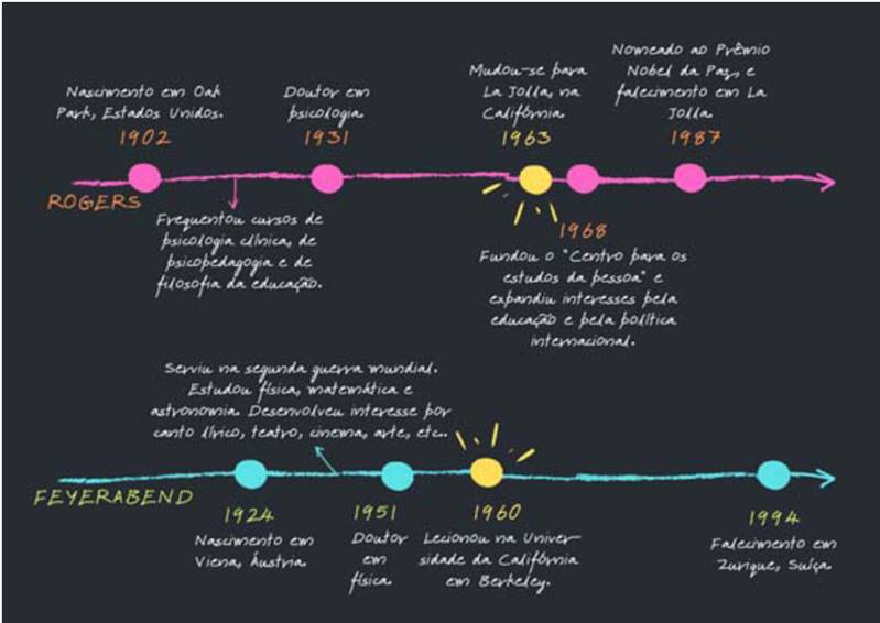 Diante disso, não se procurará no referido trabalho, prioritariamente, descrever sobre a vida e obras dos autores - algo já consagrado amplamente na literatura e pelos próprios personagens (Rogers, 1989; Feyerabend, 1995); mas, realçar aspectos a partir de suas vivências e teorias, voltadas à educação e ao conhecimento científico, que possam ser utilizados para o (re)pensar de uma formação e de uma ciência mais diversificada e humana.