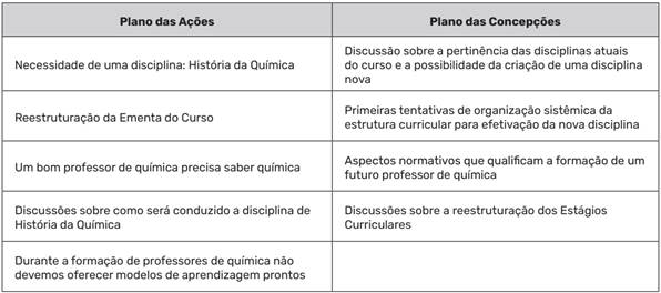 No que tange às construções conjuntas, as discussões resultaram, ao final do processo, no planejamento e implementação de uma disciplina de história da química, que era inicialmente apontada por todos como uma necessidade do curso, assim como a reestruturação das disciplinas de prática de ensino e instrumentação para o ensino de química - que são as PCC no curso -, de modo a contemplar inclusões e retiradas de conteúdos e abordagens, visando a atualização dessas disciplinas.