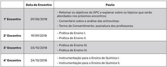 Ao total ocorreram quatro encontros com duração de 1,5 hora cada, conforme explicitado no Quadro 2. Os dados referentes aos encontros de planejamento conjunto foram obtidos por meio de gravação em áudio de todos os encontros.