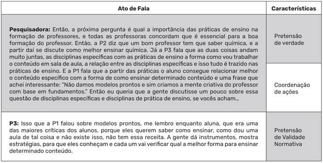 Com essa fundamentação, juntamente com os elementos que conferem força ilocucionária aos atos de fala - apresentados na metodologia - o que se realiza nesta pesquisa é um estudo sistematizado das interações comunicativas que ocorrem em um ambiente dedicado ao debate e ao planejamento conjunto (GPC) entre docentes formadores de professores de química durante a reelaboração das disciplinas de prática de ensino de química.
