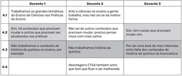 O Quadro 4, por exemplo, concatena as sínteses das respostas das docentes com respeito à questão “Em sua opinião, o conjunto das disciplinas do curso de Licenciatura em Química da Instituição contemplam tudo que um futuro professor deve saber para lecionar no ensino médio”? As intersecções das preocupações temáticas comuns entre as formadoras entrevistadas são sombreadas em cores iguais. As numerações presentes na primeira coluna dos quadros tratam de uma codificação das linhas desses quadros para que seja possível se referir ao conteúdo dessas linhas de forma mais específica ao longo do texto; e os elementos destacados na mesma cor representam preocupações temáticas comuns entre os formadores entrevistados.