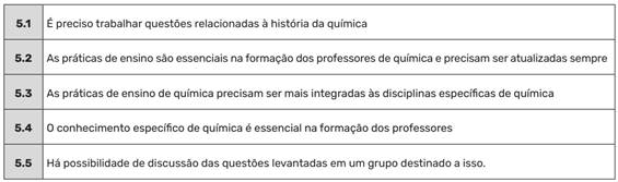 Com as entrevistas iniciais, foi possível observar um cenário de preocupações temáticas comuns sobre a organização das disciplinas de ensino de química (linha 5.2), sobre as necessidades de atualização do curso no concernente ao ensino de química (linha 5.1), sobre a importância da relação entre as disciplinas específicas e as disciplinas de prática de ensino (linha 5.2 e 5.4), e, principalmente, concluir sobre a necessidade de uma maior interação entre os docentes formadores (linha 5.5).