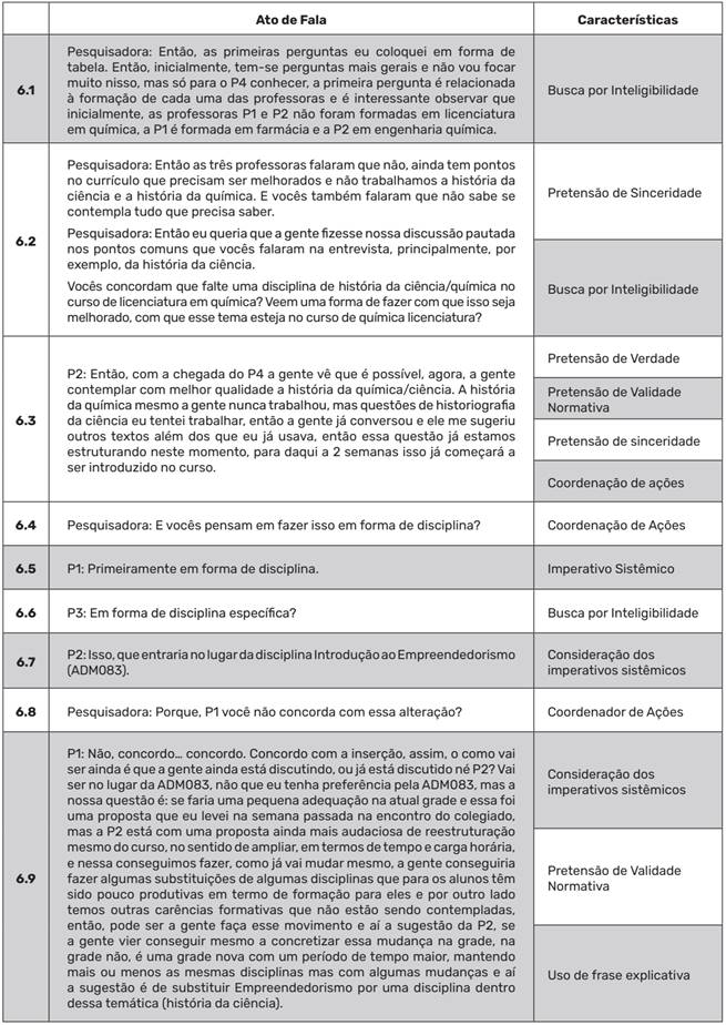 Assim, esses excertos foram caracterizados segundo as características de uso comunicativo da linguagem - força ilocucionária - descritas no dispositivo de análise seguido. Seguindo esses passos metodológicos, foi possível compreender o processo comunicativo que ocorreu no GPC com professores formadores que atuam na licenciatura em química, assim como as construções conjuntas no plano das ações e das concepções empreendidas por esses formadores a partir da análise das características comunicativas dos debates empreendidos.