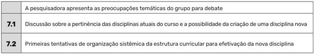 O conjunto das construções conjuntas apresentadas no Quadro 10 sistematiza as “conquistas” do grupo, ou seja, as resoluções, acordos e realizações que foram consensuadas pelos seus membros e que foram fruto de um acordo comunicativo. As mudanças nas ementas das disciplinas e a criação de uma disciplina foram consensuadas pois fazem parte de um encontro bastante relevante, a junção das preocupações temáticas com os espaços de ação comunicativa, nas quais as demandas comuns são objeto de discussão aberta e intersubjetivamente mediada. Resultados aproximados destes em estudos empreendidos na formação continuada de professores da educação básica são encontrados nas pesquisas de Lopes e Carvalho (2018) e Bortoletto (2012).