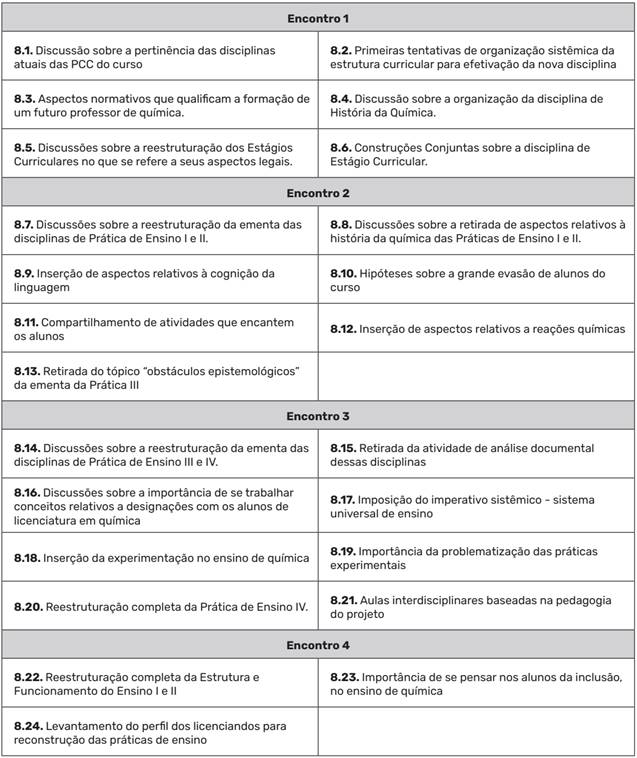 Nota-se, pode exemplo, no Encontro 2 (8.7, 8.8, 8.8, 8.13), uma reestruturação significativa nos tópicos das ementas de duas das disciplinas de prática de ensino, com a retirada de tópicos das ementas e discussão de novos tópicos para concatenar essas disciplinas de prática de ensino com a necessidade de atualização do curso. Ressaltamos que essas construções conjuntas representam aquelas decisões/consensos/afirmações que foram acordo mútuo entre os docentes, de modo que são resultantes de um debate comunicativo.