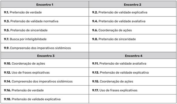 Ressaltamos, nas nossas análises, uma relação entre as construções conjuntas empreendidas pelos docentes no GPC e os elementos de uso comunicativo da linguagem, como é possível verificar na comparação entre os encontros 1 e 2 com os encontros 3 e 4, no Quadro 9. Nesse caso, se verifica os participantes utilizando mais frases explicativas, argumentações e pretensões de validade avaliativas, enquanto nos primeiros, encontros, nos momentos de constituição do ambiente possibilitador de ação comunicativa, eram mais proeminentes as buscas por inteligibilidade e pretensões de sinceridade.