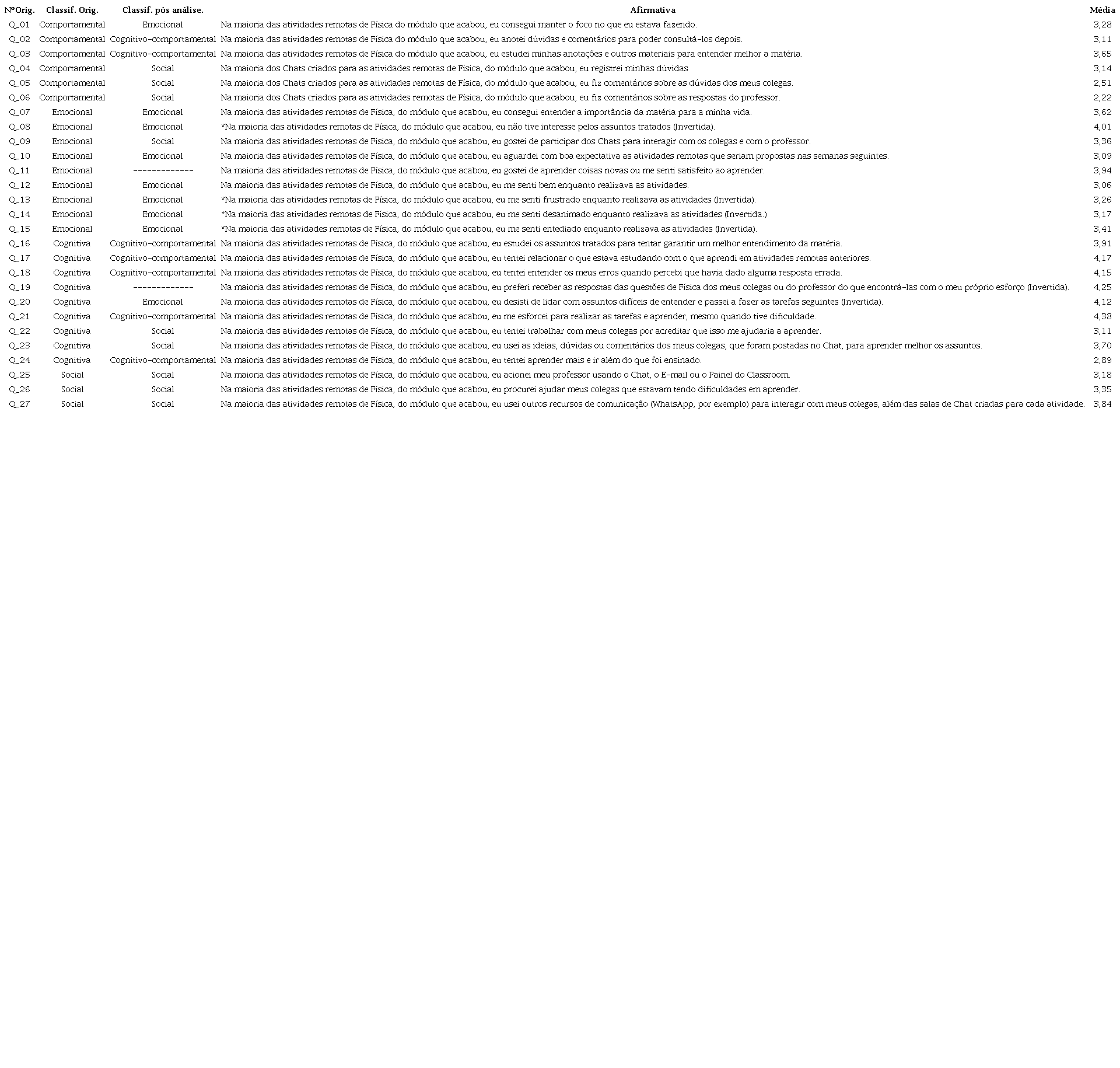 Os valores médios das respostas dadas a cada uma das vinte e cinco afirmativas reunidas em nosso instrumento de pesquisa nos permitem entender melhor como o engajamento dos estudantes variou. Se considerarmos que valores iguais ou acima de 4,0 indicam alto engajamento, vemos que há três afirmativas de alto engajamento (Q_17, Q_18 e Q_21) na dimensão Cognitivo-comportamental (43% dos itens),10 duas afirmativas de alto engajamento (Q_08 e Q_20) na dimensão Emocional (22% dos itens) e nenhuma afirmativa com alto engajamento na dimensão Social.