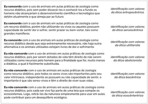 Os parâmetros da pesquisa se constituíram da representação das aulas práticas e com animais na graduação; realização de coletas; fatores influenciadores na escolha do curso; conhecimentos sobre o Princípio 3R, cláusula da objeção de consciência e MA. A análise do posicionamento ético se deu através da concordância, acessada por meio de atribuição de valores de 0 a 9, para assertivas sobre o uso de animais em aulas práticas, construídas com base em valores éticos antropocêntricos, utilitaristas, biocêntricos, ecocêntricos e abolicionistas (Quadro 1). Os parâmetros foram analisados comparativamente de acordo com as variáveis: estudante/formado, instituição pública/privada, professores do ensino básico/superior; docência do ensino privado/público e conclusão do curso anterior a 2008 (período em que não havia regulamentação ao uso de animais em aulas), entre 2008 e 2013 (período de implementação da lei 11.794/08) ou após 2013 (regulamentação legal).