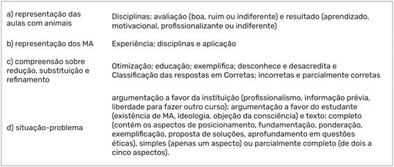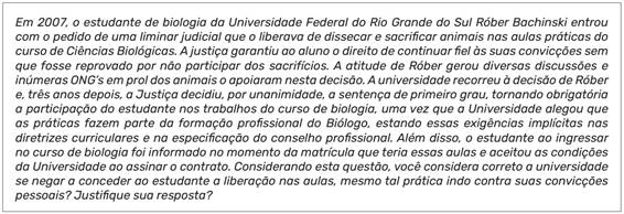 Ao final do questionário foi apresentada uma situação-problema baseada no caso real do estudante de biologia Róber Bachinski da Universidade Federal do Rio Grande do Sul, que teve um conflito com a IES por se recursar a assistir aulas práticas com animais (Quadro 2). Foi solicitado ao participante que se posicionasse a favor do estudante ou da instituição e discorresse sobre seus argumentos.