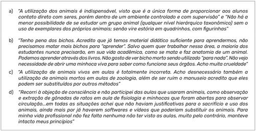 A maioria dos respondentes afirmou ter assistido aulas com cadáveres de animais (Fig. 3). Porém, o relato da representação do animal nas aulas práticas evidenciou três públicos: a) os que eram favoráveis à utilização de animais e consideram-na insubstituível; b) aqueles que apesar de não se sentirem confortáveis, legitimaram o uso argumentado na necessidade; c) aqueles que discordaram do uso e concordavam com os MA e que buscavam aplicar o direito da cláusula da objeção de consciência (Quadro 4). Contudo, a maioria dos respondentes considerou as aulas boas e as relacionaram com o aprendizado, sendo que os graduandos foram mais contundentes do que os professores, e a maior frequência de indiferença foi registrada para os estudantes de IES privada, em final de curso e formados (Fig. 3). A relação das aulas com animais com o aprendizado foi mais pronunciada em estudantes e bacharéis, enquanto os professores relacionaram-nas como motivacional, profissionalizante ou indiferente. Como posicionamento ético predominou a concordância com assertivas utilitaristas (Fig. 2).