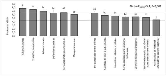 A hipótese 1 (H1) foi parcialmente confirmada, uma vez que a identificação com os elementos da natureza se destacou como condicionante da escolha do curso de biologia, corroborando Fischer et al. (2012). Ainda, os respondentes colocaram no mesmo grau de importância a intenção de defender os animais e salvar o planeta com a satisfação de vivenciar aulas com animais e poder manipulá-los. Indicando, assim, uma perspectiva de legitimação do uso de animais pela necessidade da formação técnica. Contudo, embora em um primeiro momento tenha sido evidenciado um processo de insensibilização para limitações éticas, sustentando um viés utilitarista, foi identificada igualmente uma receptividade para os MA, os quais foram pontuados em mesmo grau de concordância.
