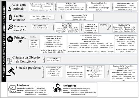ABSTRACT: Intending to meet the 2nd stage of the educational reconstruction model, we aimed to characterize the representation of the animal as didactic resource and alternative/substitute methods for graduates, bachelors, and undergraduates of the biological sciences course. The 331 responses obtained through an online questionnaire showed that although the choice of the course is passionate, that there is adherence to alternatives and knowledge of ethical principles, many participants legitimized the classes with animals. The instrument allowed us to identify the peculiarities of each group, mainly associated with the level of education and graduation before or after Law 11.794/08. The results point to the importance of associating training with a methodological theoretical framework, enabling training for technical and educational functions with humanitarian, ethical, critical, responsible, and sustainable conduct.