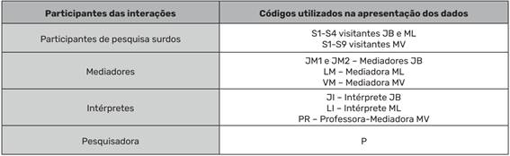 Os participantes da pesquisa compreenderam um grupo de nove jovens surdos - cinco deles participaram apenas da visita ao MV, enquanto os outros quatro jovens participaram das três visitas. Os quatro jovens que participaram das três visitas apresentavam algumas características em comum: a surdez profunda, sendo membros de famílias ouvintes, haviam sido alfabetizados e usavam a Libras para comunicação e atuavam como bolsistas do programa Jovens Talentos da Fundação CECIERJ em apoio à FAPERJ, em 2019, em projeto sobre acessibilidade científico-cultural. Três dos jovens eram do sexo masculino e um, do feminino, sendo o desequilíbrio de gênero decorrente da forma como eles foram escolhidos, a saber, por fazer parte do projeto.