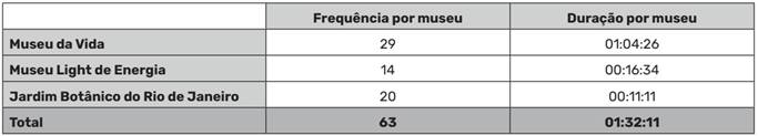 As visitas tiveram duração total de 3h37min35s, tendo o registro em vídeo duplicado pela gravação das duas câmeras (7h20min31s de gravação). Pelas diferenças de percurso em cada museu, a visita ao MV teve a duração de 53min49s, a visita ao ML, 1h06min20s e a visita ao JB, 1h38min26s.