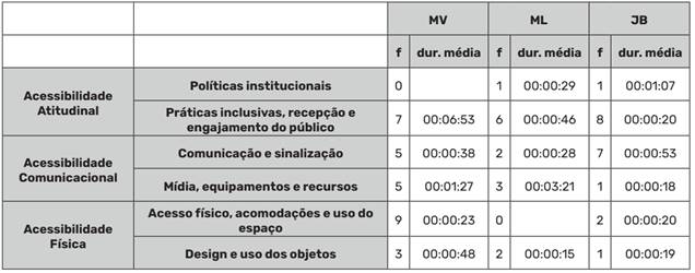 Houve 63 ocorrências dentre os seis códigos de acessibilidade analisados, sendo 29 no MV, 14 no ML e 20 no JB (Quadro 3). As ocorrências podem se sobrepor em determinados trechos das visitas, gerando co-ocorrências nas análises. Além disso, calculamos a duração média por código, buscando identificar sua relação com a frequência de aplicação (Quadro 4). É possível perceber que alguns códigos, como o de Práticas inclusivas, recepção e engajamento do público, no JB, apresentam frequência maior em relação a outros códigos aplicados (f=8) e sua duração média é baixa (20s). O contrário também ocorre, códigos como o de Políticas Institucionais, no JB, têm uma frequência baixa (f=1) e uma duração média maior (1min7s). Dessa forma, foi importante para a análise do presente trabalho apresentar a relação entre ambas as variáveis: duração e frequência.