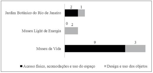 Nesse caso, a acessibilidade física (Gráfico 1), voltada não só ao acesso à exposição, mas também à concepção e disposição de objetos, assume um papel secundário para os surdos (por ser a surdez uma deficiência sensorial). Entretanto, os participantes demonstraram preocupação com o tema, especialmente quanto à surdocegueira. Os jovens apontaram a importância da acessibilidade para usuários de cadeiras de rodas, como a existência de rampas e a disposição dos objetos em diversas alturas, ao alcance de públicos variados, no MV e no ML.