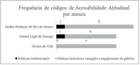 Em razão de estar a acessibilidade atitudinal fortemente relacionada à acessibilidade comunicacional, incluindo os discursos, equipamentos e políticas que orientem a comunicação nas instituições museais, foram observadas frequências dos dois subcódigos a ela relativos, Políticas Institucionais e Práticas inclusivas, recepção e engajamento do público (Gráfico 3) (Norberto Rocha et al., 2020).