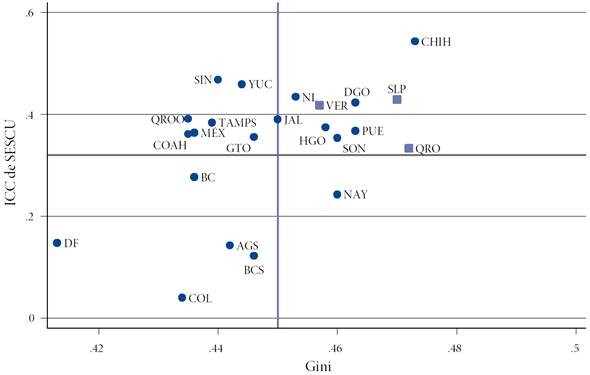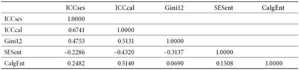 La matriz de correlaciones sugiere que existe una asociación alta (r=0.51) entre el ICCcal y Gini 12; es decir, entre el efecto escuela y el índice Gini de las entidades, de modo que los estados con mayor concentración del ingreso tienden a registrar también sistemas educativos en los que el peso de la escuela en los resultados de los alumnos tiende a ser ligeramente mayor. Esto es tanto como decir que a mayor desigualdad social, el peso de la escuela en la explicación de los aprendizajes tiende a ser mayor, o que en las entidades más desiguales la escuela pesa moderadamente más en los resultados de los alumnos.