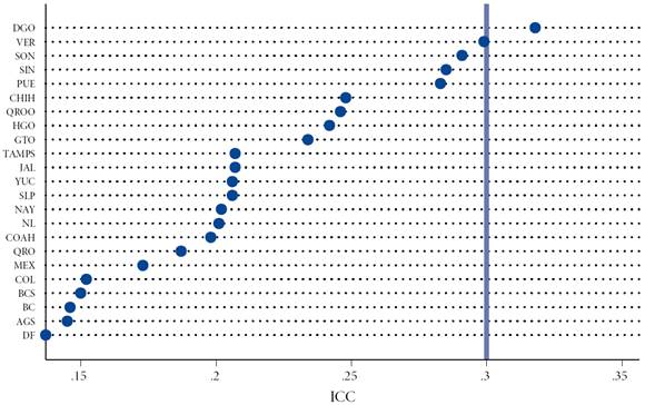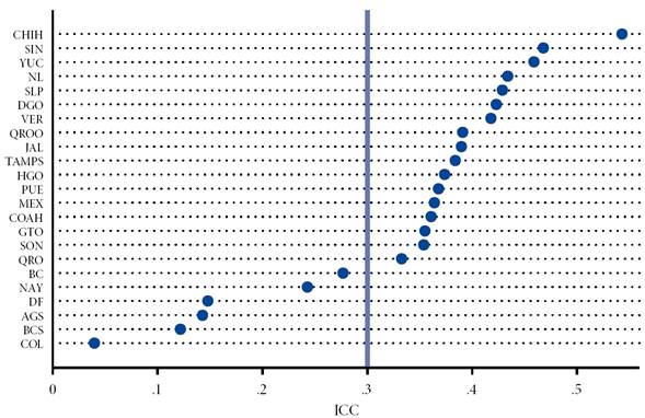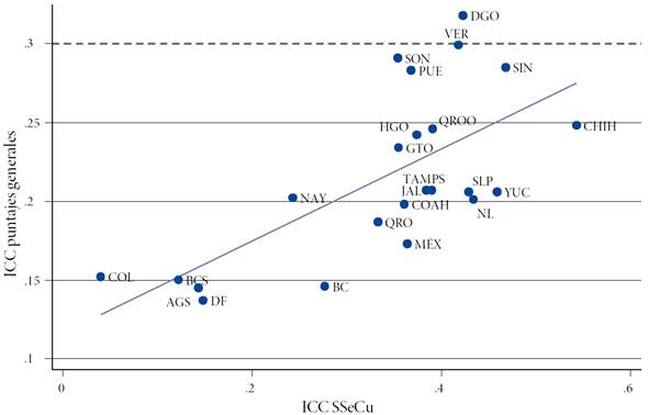 Durango y Veracruz resultan los casos más sobresalientes en términos de la doble estratificación: puntajes y SSECU. El resto de entidades (por debajo del ICC de 0.3) sólo registran la estratificación escolar, con Chihuahua y Sinaloa como los casos más extremos.