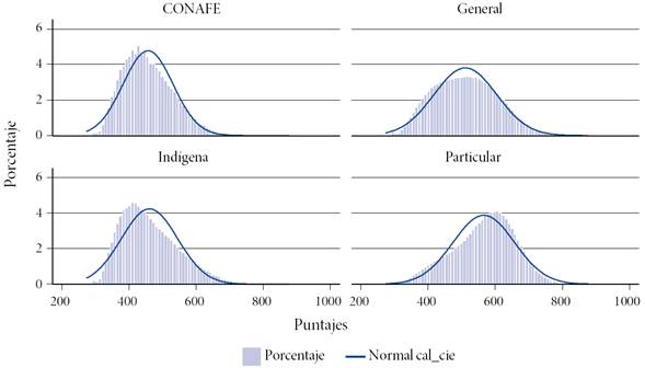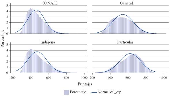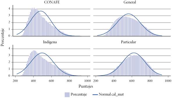 En estas gráficas los CONAFE, así como las primarias indígenas, muestran distribuciones sesgadas a la derecha con medias inferiores a las que muestran tanto las primarias generales como las privadas. Este patrón se repite en todas las asignaturas evaluadas (los detalles estadísticos de estas distribuciones se pueden ver en la Tabla 1).