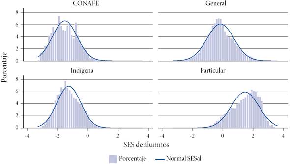 La estratificación de los resultados educativos según la modalidad escolar coincide con una alta estratificación de estas últimas por el SSECU de los alumnos. Así, al observar la Gráfica 4 se puede inferir la forma en que se distribuye dicho estatus. 16