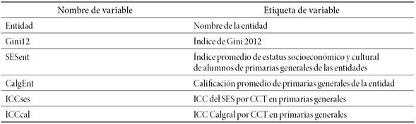La segunda base de datos utilizada contiene información de 23 entidades federativas a partir de seis variables que incluyen el índice de Gini de 2012 calculado por el INEGI; el índice promedio de estatus socioeconómico y cultural (calculado con la base de datos de alumnos); y otras variables que se enlistan en el Cuadro 1.