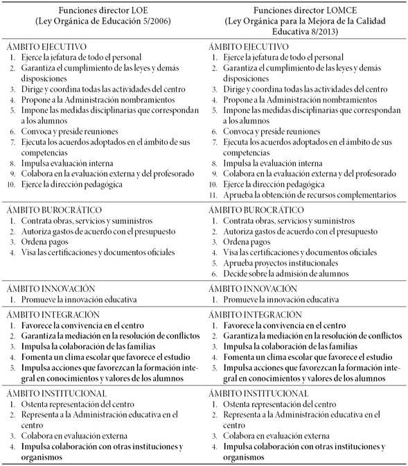 Para profundizar en el perfil de director esbozado en el marco normativo actual es necesario analizar las competencias -conjunto de conocimientos y cualidades profesionales necesarias para que un trabajador desempeñe con éxito las funciones y tareas que definen su puesto de trabajo (Karen y Vega, 2001)- y el proceso de acceso -factor que condiciona su actuación posterior-. Para tal cometido hemos realizado un análisis comparativo entre las competencias, funciones y modo de acceso a la dirección definidos en la ley anterior (LOE) y la actual (LOMCE), a partir del cual podremos observar hacia qué modelo de dirección nos han llevado.