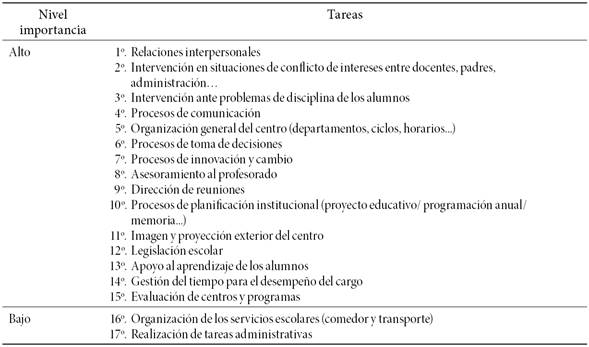 A partir de los resultados obtenidos en dicha investigación nos centraremos en el análisis de las competencias directivas más demandadas desde la práctica educativa. De lo que se trata es de conocer y comprender cuáles son las necesidades reales de la dirección escolar desde la perspectiva de los sujetos implicados, es decir, las competencias necesarias en este contexto para afrontar con la mayor eficacia la dirección. Para ello analizaremos cuáles son las tareas valoradas como más relevantes por directores en ejercicio. Los resultados los hemos sintetizado en el Cuadro 2: