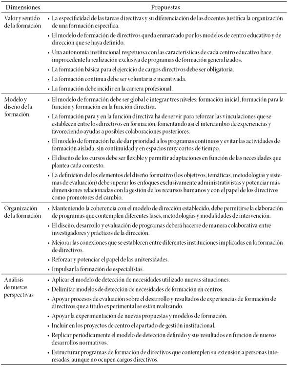 De este modo, cualquier propuesta formativa debe tener un conocimiento profundo de esta situación: el director parece tener ciertas capacidades que le otorga el mismo nombramiento por sí mismo; posee un perfil disperso y rodeado de incertidumbre, con una formación deficitaria; y todo ello se encuentra enmarcado legislativa y socioculturalmente. No solamente muchas veces no se forma a los maestros en aquellas competencias necesarias en relación al modelo de dirección que tenemos, sino que globalmente tampoco se responde adecuadamente a las necesidades sentidas de los directores. Considerando esto, son dos los pilares básicos en los que deberían sustentarse las propuestas formativas que a su vez deberían estar determinadas por normativa: a) establecer unas competencias básicas fundamentadas en las necesidades reales; y b) desarrollar un plan de formación específico.