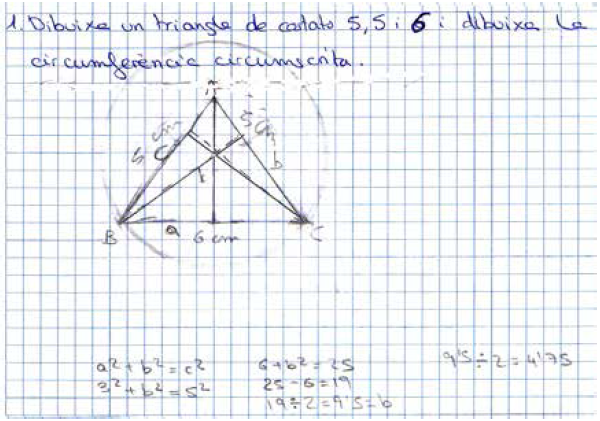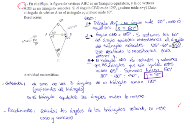 Tal como se esperaba, los alumnos tuvieron dificultades para entender la consigna y preguntaron qué se debía entender por actividad matemática. El profesor se limitó a hacer algunos comentarios sobre que convenía distinguir entre la tarea y la actividad matemática realizada para resolverla; comentó que ésta consistía en una secuencia de acciones (prácticas) en la que se utilizaban representaciones, definiciones, procedimientos; que si había representaciones era porque se había realizado un proceso de representación, y si había un argumento había un proceso de argumentación. También comentó otros procesos, como el de resolución de problemas y el de modelización. El profesor escribió en la pizarra cuatro términos: representaciones, definiciones, procedimientos y procesos. El objetivo era dar alguna herramienta para el análisis de la actividad matemática, pero sin llegar al extremo de dar un modelo explícito para el análisis de dicha actividad (en concreto, no se citó explícitamente la categoría “proposición” o “propiedad”).