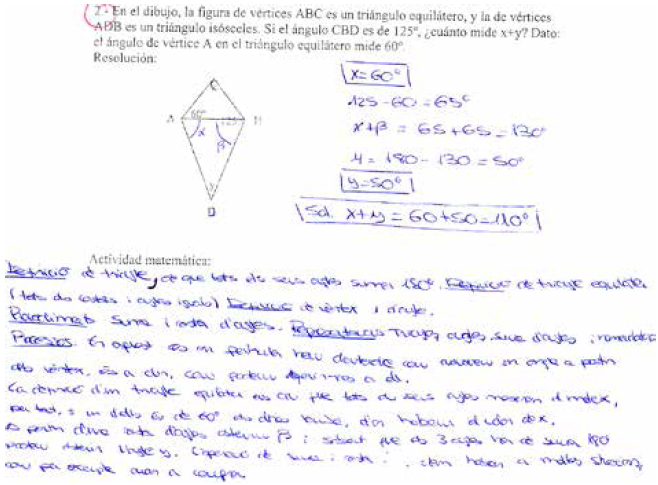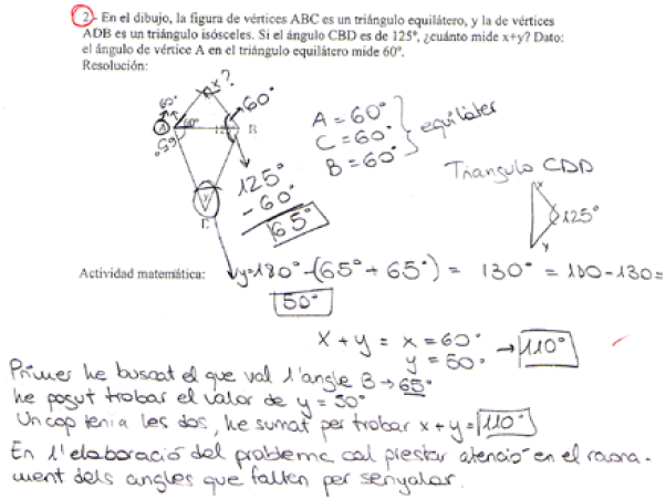 Al observar la competencia en análisis didáctico de la actividad matemática realizada para resolver los tres problemas propuestos, podemos afirmar que las producciones de los alumnos muestran niveles de análisis muy diferentes: en un extremo tenemos el alumno que no hace ninguna descripción de la actividad matemática y se limita a escribir la respuesta (correcta o incorrecta) del problema; después tenemos el alumno que, además de escribir su resolución, realiza una descripción donde el énfasis se pone en narrar las acciones que realizó, pero sin categorizarlas en términos de definiciones, procedimientos, etc. 4 Este último caso sería el caso del alumno siguiente (Fig. 5):